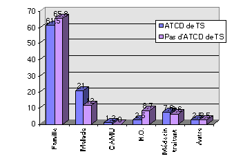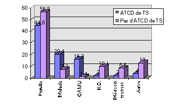 Dans notre étude, et dans les deux sous-populations, líhospitalisation se fait le plus souvent à la demande du patient lui-même quand celui-ci a des ATCD de TS. Ceci trouve probablement son explication dans le fait que ces patients sont marqués par cette mauvaise expérience et redoutent de recourir à nouveau à cette extrémité.