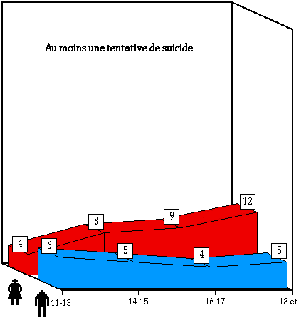 Les femmes sont plus en risque de passer à l'acte que les hommes, qui, eux, sont plus en risque de décès Le risque de décès par suicide augmente avec l'âge alors que le risque de tentatives de suicide décroît Ainsi, au total, la mortalité concerne essentiellement les hommes âgés alors que la morbidité concerne surtout les femmes jeunes Le mode de suicide (tous âges) le plus fréquent est la pendaison (37 %), suivi de l'arme à feu (25 %, données 1995, Inserm, SC 8). Parmi les 15-24 ans, la pendaison reste le premier moyen (36 %), mais l'arme à feu occupe une place plus importante (31 %), suivies de loin par l'intoxication (10 %) et la noyade (2 %). Les garçons de 15-24 ans, comme les hommes en général, utilisent plus volontiers des moyens violents (74 % se suicident par la pendaison ou l'arme à feu), alors que les filles du même âge ont recours à des modes plus diversifiés (27 % par pendaison, 25 % par intoxication, 19 % par précipitation, 15 % par arme à feu). Les tentatives de suicide sont faites à l'aide de médicaments dans 90 % des cas, dont 50 % par les tranquillisants Quant au motif, la majorité des jeunes évoquent un fait précis Les idées suicidaires, dont la gravité dépend autant de la chronicité (idées suicidaires récurrentes) que de l'intentionnalité (désir de mort, préparation de l'acte, achat de toxiques...), ont été moins souvent étudiées Plus encore que sur le comportement suicidaire, des comparaisons internationales peuvent être soumises à des critiques (comparabilité des instruments de mesure et des populations étudiées). Toutefois, on est surpris par la concordance des études. Ainsi, parmi les 15-19 ans, aux États-Unis, 26 % des garçons et 41 % des filles ont pensé au suicide durant les douze derniers mois Le rapport idées de suicide/tentative de suicide se situe autour de 4, en France comme aux États-Unis Reste que la chronicité des idées suicidaires est un facteur de risque de passage à l'acte. Si seulement 8 % des garçons et 13 % des filles pensent souvent au suicide, 41 % parmi eux ont fait une tentative de suicide, alors qu'ils ne sont que 1 % parmi ceux qui n'ont jamais eu de telles idées La corrélation entre suicide et statut matrimonial (du sujet et/ou de ses parents) est connue depuis longtemps et retrouvée quelle que soit l'issue létale de l'acte A propos des adolescents, plus que le statut matrimonial, c'est la qualité des relations intra-familiales qui est en cause. On cite, à ce propos, la violence entre les parents ou entre les enfants et les parents, surtout si elle est accompagnée de violences sexuelles Au regard de ces facteurs relationnels, d'autres, comme le faible niveau d'éducation des parents, le faible revenu Tous les troubles psychiatriques (sauf la démence) augmentent le risque de décès par suicide, en particulier, la schizophrénie, l'anorexie, la dépression et les troubles de l'humeur Le lien entre dépression et tentative de suicide est confirmé dans toutes les études et ce, quel que soit l'outil diagnostique utilisé Le désespoir ou l'impossibilité ressentie de résoudre ses problèmes permet d'éclairer le lien observé entre la dépression et la tentative de suicide. Le désespoir peut se traduire par un manque de projets et d'investissements, un sentiment d'incompétence, une autocritique exacerbée, des reproches récurrents et une faible estime de soi Quant à la colère et les comportements violents qui vont de pair, ces aspects sont jusqu'alors peu explorés. Pourtant, on retrouve souvent parmi les mêmes adolescents des comportements de violence sur soi et sur autrui ainsi que les violences subies Une variété de troubles du comportement s'avère associée à la tentative de suicide, allant de la consommation d'alcool ou de drogues Les recherches sur le suicide ont été souvent initiées par les psychiatres ou les psychologues et ont, de ce fait, porté plus sur les facteurs familiaux, psychologiques et comportementaux que sur les facteurs sociaux En prenant en compte un ensemble d'indicateurs sociaux, Lester Les adolescents avec des idées suicidaires récurrentes se caractérisent, comme les tentatives de suicide, par des difficultés personnelles et familiales La prise en charge des suicidants est une des priorités en Santé Publique Plus que le suicide, c'est le passage à l'acte suicidaire qui, à l'adolescence, devrait constituer un axe prioritaire de surveillance, de recherche et de prévention. En effet, un jeune sur 14 aurait déjà fait une tentative de suicide (un sur 50, une récidive) et le taux d'hospitalisation peut être estimé à environ 40 000 par an.