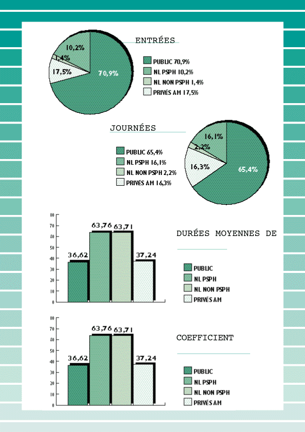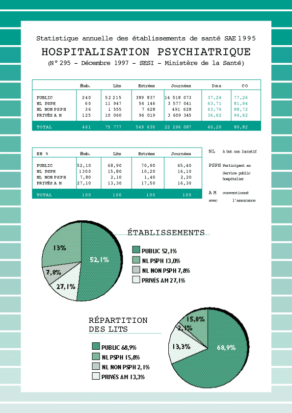 L'INVENTAIRE DES PATHOLOGIESEN CLINIQUE DE NEUROPSYCHIATRIE PRIVÉEPour réaliser un inventaire des pathologies en clinique psychiatrique, il faudrait répertorier les pratiques de chacun des cent vingt-cinq établissements, en tenant compte de la personnalité de chaque psychiatre, ainsi que des "options" choisies par chaque établissement. De fait, chaque patient est traité sur mesure par son psychiatre, lequel agit librement en utilisant les moyens mis à sa disposition par la structure. L'évidence est que nos pratiques sont différentes selon l'implantation géographique de l'établissement, l'environnement du patient, son contexte social, familial et professionnel, sans parler de sa structure de personnalité et de sa culture. Mais, affirmer que les établissements psychiatriques sont tous différents et totalement spécifiques relève de la boutade. Hormis les troubles psychiatriques nécessitant la mise en application de la loi du 27 juin 1990 pour les hospitalisations sous contrainte, nos établissements accueillent toutes les formes de troubles psychiatriques, de la simple dépression réactionnelle au psychotique plus ou moins chronique en passant par tous les états intermédiaires possibles, y compris les états d'agitations, les tentatives de suicides, etc. Nous accueillons toutes les couches sociales de la société et nos établissements sont loin de ne recevoir que des nantis comme le croit parfois le grand public. La répartition des patients est de 40 % pour les hommes et de 60 % pour les femmes. La répartition des patients par âge montre : * un premier pic pour la tranche des 40 à 49 ans (23,7 %), * un second pic pour la tranche des 60 ans et plus (27,3 %), * les femmes sont en moyenne plus âgées que les hommes. L'origine géographique de provenance des patients montre que : * 63 % des patients sont originaires du département de l'établissement, * 19 % sont hors département mais résident dans la même région, * 18 % sont originaires d'une autre région. La répartition des pathologies traitées dans nos établissements est la suivante (selon la C.I.M. 10) : 4,4 % (F0) : troubles mentaux organiques. Démence de la maladie d'Alzheimer, démence vasculaire, syndrome amnésique organique induit par l'alcool ou d'autres substances psycho-actives, syndrome post-encéphalitique, syndrome post-commotionnel ; 7,5 % (F1) : troubles mentaux et du comportement liés à l'utilisation de substances psycho-actives, liés à l'utilisation d'alcool, d'opiacés, de dérivés du cannabis, de cocaïne, d'hallucinogènes, de sédatifs hypnotiques ; 26 % (F2) : schizophrénie, troubles schizotypiques, troubles délirants. Schizophrénie (paranoïde, hébéphrénique, catatonique, résiduelle, simple), troubles délirants persistants, troubles psychotiques aigus et transitoires, troubles délirants induits, troubles schizo-affectifs de type maniaque, de type dépressif ; 20,5 % (F3) : troubles de l'humeur. Épisode maniaque, trouble affectif bipolaire, épisodes dépressifs, trouble dépressif récurrent (avec ou sans syndrome somatique, avec ou sans symptômes psychotiques), troubles de l'humeur persistants (cyclothymie, dysthymie) ; 19,8 % (F4) : troubles névrotiques, troubles liés à un facteur de stress, troubles somatoformes. Troubles anxieux phobiques, trouble obsessionnel-compulsif, état dépressif réactionnel, troubles dissociatifs de conversion, troubles somatoformes ; 4 % (F5) : syndromes comportementaux associés à des perturbations physiologiques et facteurs physiques. Les troubles de l'alimentation (anorexie mentale, boulimie), les troubles du sommeil non organiques (insomnie non organique, hypersomnie non organique, somnanbulisme (cauchemars, terreurs nocturnes) ; 9,6 % (F6) : troubles de la personnalité et du comportement chez l'adulte. Troubles de la personnalité (personnalité paranoïaque, personnalité schizoïde, personnalité dyssociale, personnalité dépendante, personnalité anxieuse), troubles des habitudes et des impulsions (pyromanie, kleptomanie), troubles de l'identité sexuelle et de la préférence sexuelle ; 1 % (F7) : retard mental chez l'adulte. Ce sont les débilités légères ou graves, les oligophrénies, les déficiences mentales profondes ; 0,9 % (F8) : troubles du développement psychologique chez l'adulte. On trouve dans cette catégorie les troubles spécifiques du développement et du langage, les troubles des acquisitions scolaires, les troubles du développement moteur, les troubles du développement (l'autisme en particulier) ; 1,2 % (F9) : troubles du comportement et du développement apparaissant dans l'enfance se manifestant chez l'adulte. Les troubles hyperkinétiques, les troubles des conduites, les troubles émotionnels débutant dans l'enfance, les troubles du fonctionnement social. Cette longue liste montre toute la diversité des thérapeutiques et des prises en charge mises en place dans les cliniques de neuropsychiatrie privées. Nos établissements accueillent et traitent toutes ces formes de troubles, essentiellement en hospitalisation complète, en placement libre. Cette énumération de troubles psychiatriques et de pourcentages aurait tout aussi bien pu être faite par le public, car une récente enquête faite en région PACA en juin 1997 a montré que les pathologies ainsi que les catégories socioprofessionnelles étaient identiques en pourcentage dans le public et dans le privé. Docteur Pierre Rance (Marseille) *